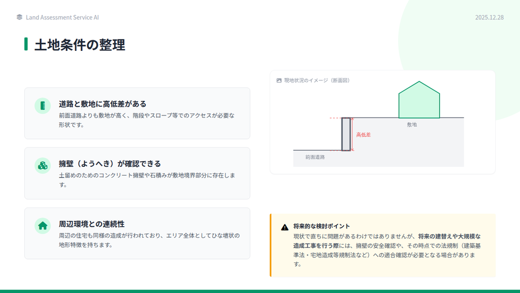 - 将来の資産価値に影響する地形的弱点