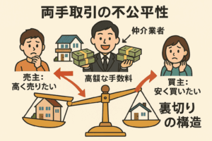 しかし、両手取引では、仲介業者は**「両方から手数料をもらう立場」**にあります。