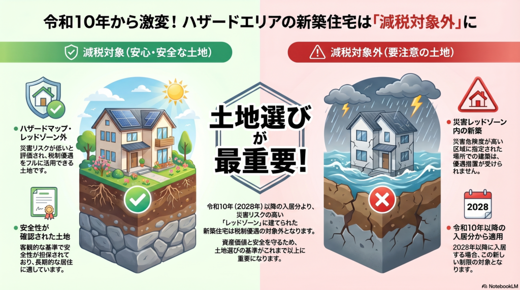 ここが今回の改正の重要なポイントです。安全な街づくりを促進するため、「災害レッドゾーン」などの危険なエリアに建てる新築住宅については、住宅ローン減税や固定資産税の減額が適用対象外となる措置が導入されます。