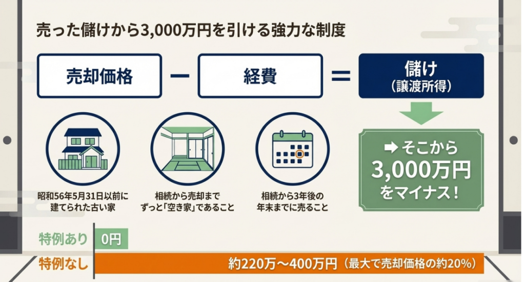 相続した古い実家(昭和56年5月31日以前の建築)を売却する際、「被相続人の空き家に係る3,000万円特別控除」を適用できれば、売却益から最大3,000万円を差し引ける制度があります。