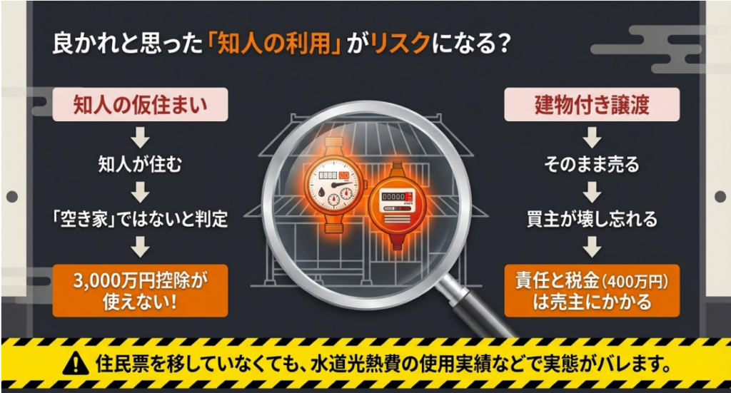 無償であっても、生活実態があるとみなされれば「空き家」の定義から外れます。税務署は水道・電気・ガスの使用実績などで居住実態を確認するため、住民票を移していなくても把握されます。