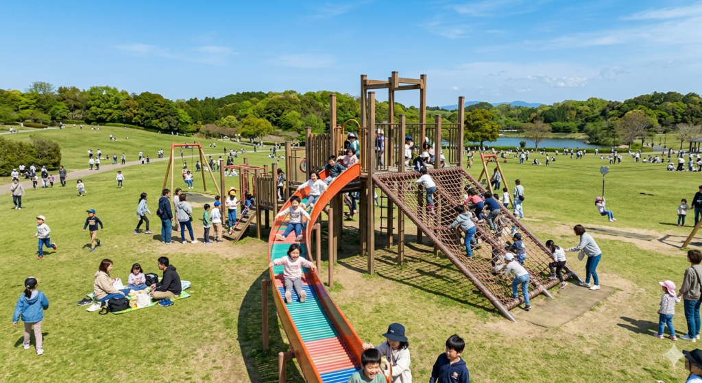 147,000㎡という広大な敷地に大型のローラー滑り台・クライミングネット・ターザンロープなどの遊具が充実。1日中遊んでも飽きない、ファミリーの定番スポットです。お弁当を持ってピクニックも最高です。