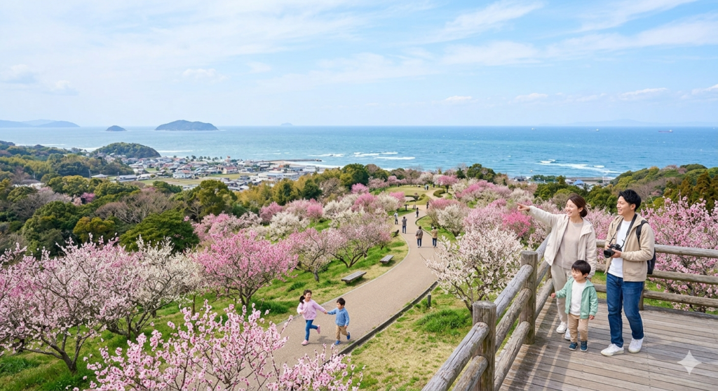 春にはあんずの花が咲き誇り、初夏には実をつけます。展望園地からは玄界灘が一望でき、リフレッシュにも最適。滑り台やターザンロープがあり、自然を感じながら体を動かせます。