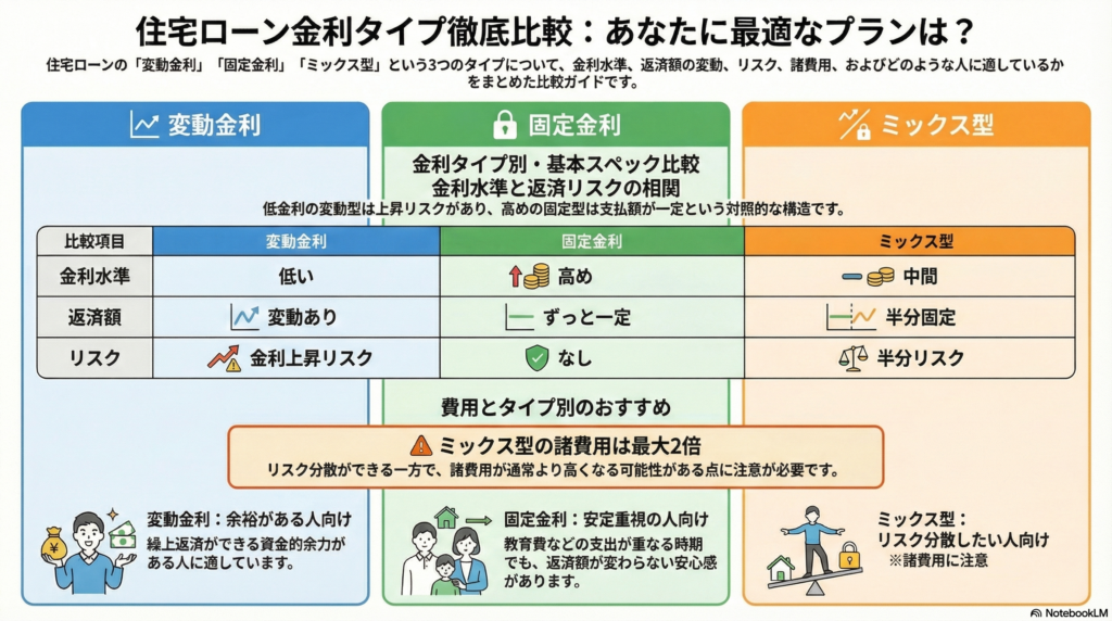 数字の動きを追う前に、まずは「どんな仕組みがあるのか」という土台を知ることが大切です。住宅ローンの金利タイプは大きく分けて以下の3種類があります。