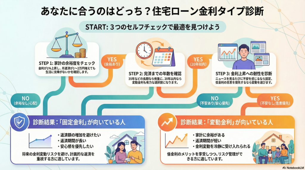 「金利が上がったらどうしよう」と毎日不安になるくらいなら、少し高くても固定金利という「安心」を買う方が生活の質は上がります。