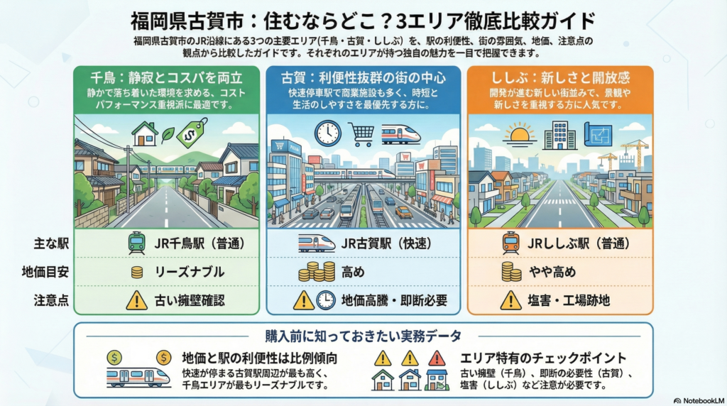関連記事:「あなたのライフスタイルに合う街はどこ?宗像・福津・古賀の住みやすさを徹底比較」 関連記事:「古賀市日吉エリアで海が見えるマンション|地理学視点で読む立地の魅力とリスク」