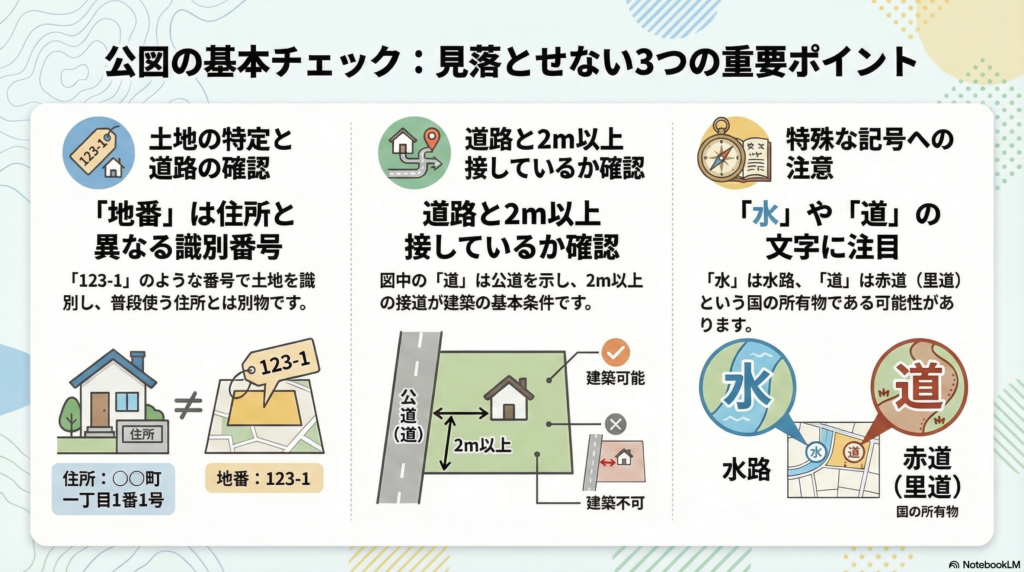 建物を建てるには、原則として「幅4m以上の道路に、土地が2m以上接している」必要があります(接道義務)。公図を見て、自分の買おうとしている地番と道路の間に、知らない人の小さな土地(地番)が挟まっていたら要注意です。道路に接していないとみなされ、再建築不可になる恐れがあります。