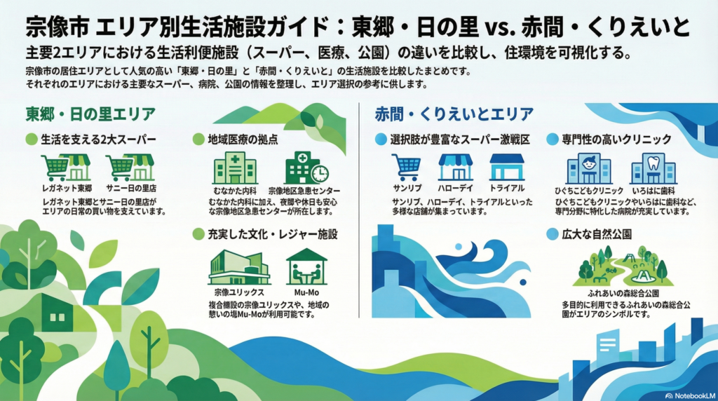 「住みやすい」とは聞くけれど、実際の暮らしの利便性はどうなの?という移住検討中の方へ。2026年4月現在の最新情報に基づき、「東郷エリア」「赤間エリア」の2大拠点を中心とした、地元民御用達のリアルな生活施設をまとめました。