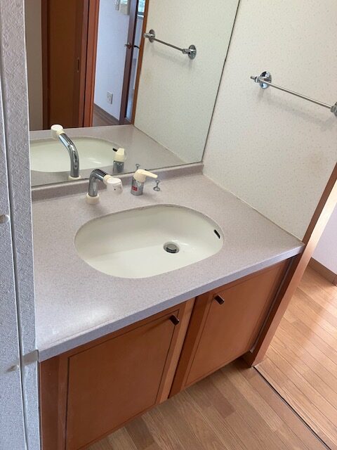 清潔な洗面台。収納も備えています(2026年2月撮影)