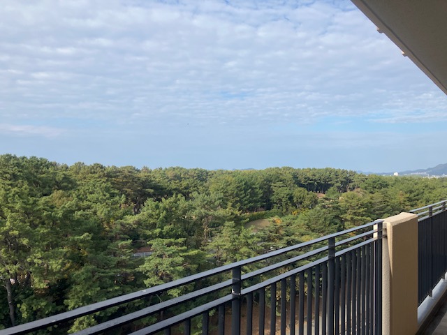 バルコニーからは、「古賀ゴルフ・クラブ」の豊かな緑と、その先に広がる玄界灘の海を望むことができます。