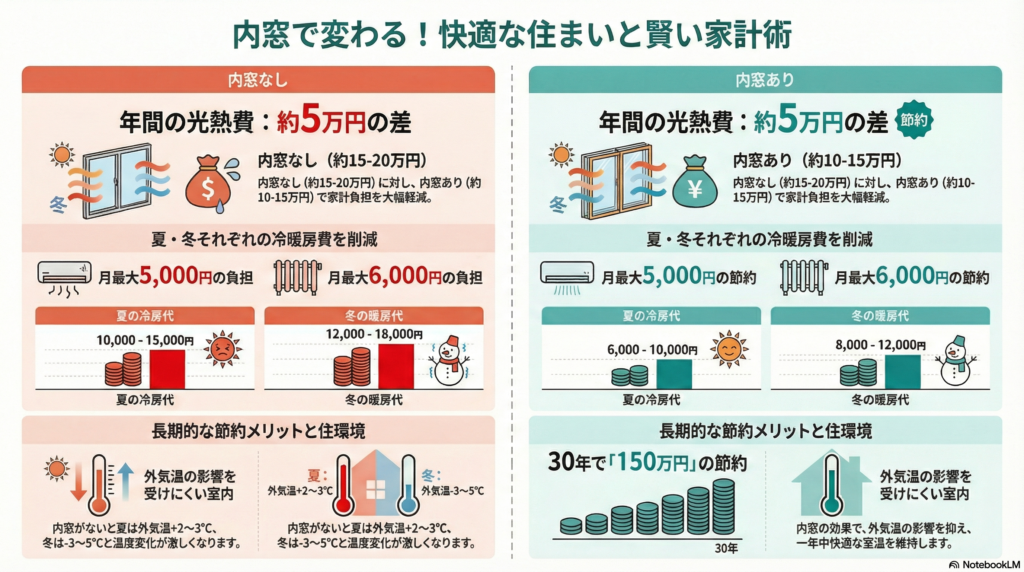 • 断熱性能の向上: 冬の寒さや夏の暑さを和らげ、冷暖房効率を高めます。