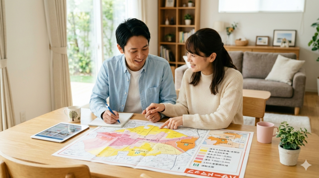 ハザードマップの色の意味、正しく読めていますか?黄色は膝下・濃いピンクは2階浸水など色ごとの意味を解説。さらに「色がない=安全」ではない落とし穴も。福岡で土地購入を検討中の方必読です。 -