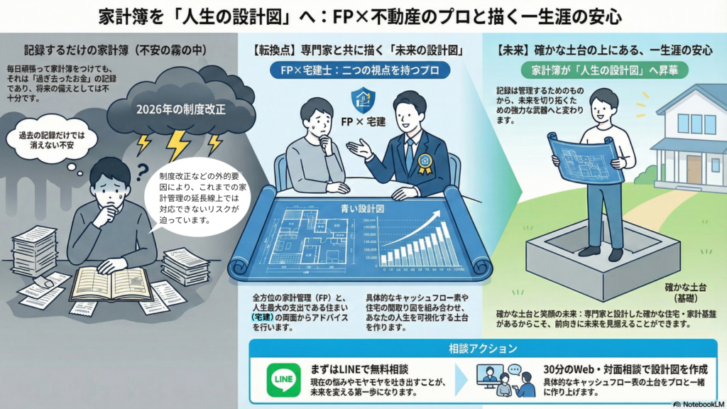 「家計簿をつけても将来の不安が消えない理由とは?FP2級×宅建士のダブルライセンスを持つFUSUMALABが、キャッシュフロー表という"人生の設計図"の重要性をわかりやすく解説します。まずはLINEで無料相談。」 -